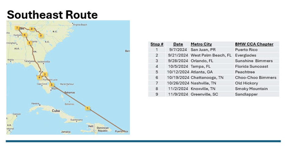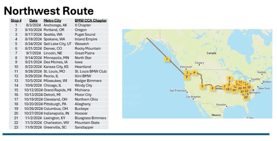 2024 is the 25th Anniversary of the launch of the X5 and the X brand so the X Chapter is celebrating in a big way. To make this celebration extra special, we’ve planned the ultimate road trip in X Drives America. Seeking to connect with all of our members and the broader BMW CCA community, we’ve designed a road trip of four simultaneous routes with stops along the way at each of the BMW CCA’s geographic chapters. Each chapter has been asked to host an event, aligned to the dates of X Drives America. We have miniature X5 models that need to travel from Anchorage, Honolulu, Toronto and San Juan to each of the geo chapters and then to Greer, SC all in time for a special November celebration. This is where you come in – we need your help to complete each leg of the route and ensure the X5s make it to the celebration in time!