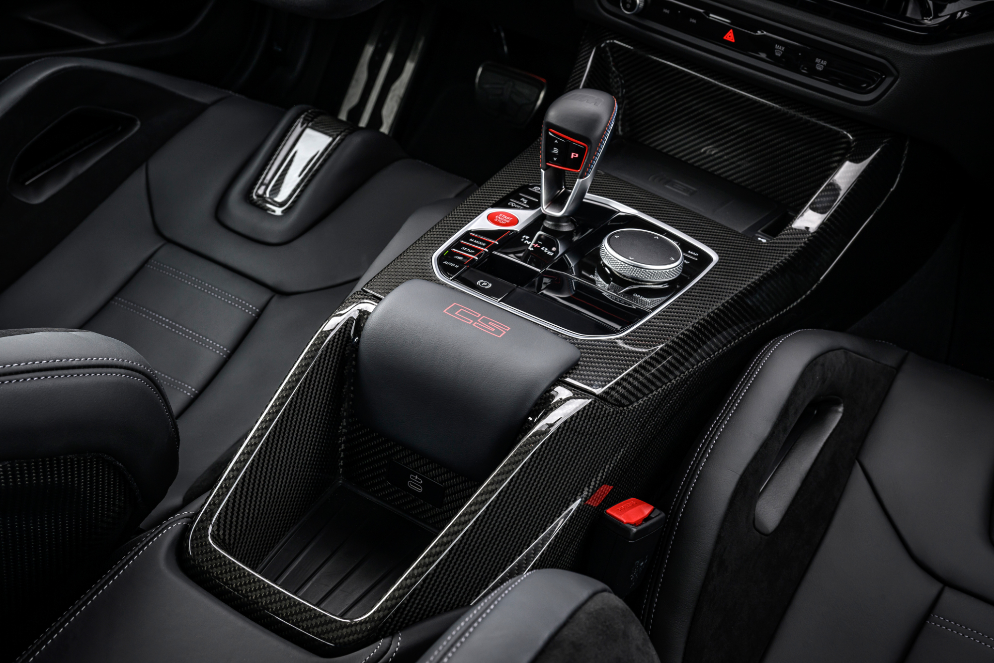 With a flat-bottomed rim, gearshift paddles, a red center marker at 12 o’clock, and two M buttons for selecting individually configured vehicle setups, the standard heated M Alcantara steering wheel features a traditional three-spoke design and brings Motorsport flair to the cockpit. The trim elements in the instrument panel and center console are finished in carbon fiber. Additional details include a red “CS” logo on the carbon fiber center console, M seatbelts, black threshold plates with an “M2 CS” logo and red outline. Now illuminated with the “CS” logo, the door trim panels certainly grab the attention. The color of the lighting used here can be set individually with the standard ambient lighting. When switched off, a carbon structure is visible. Rounding off the sporty interior is the M Anthracite headlining.