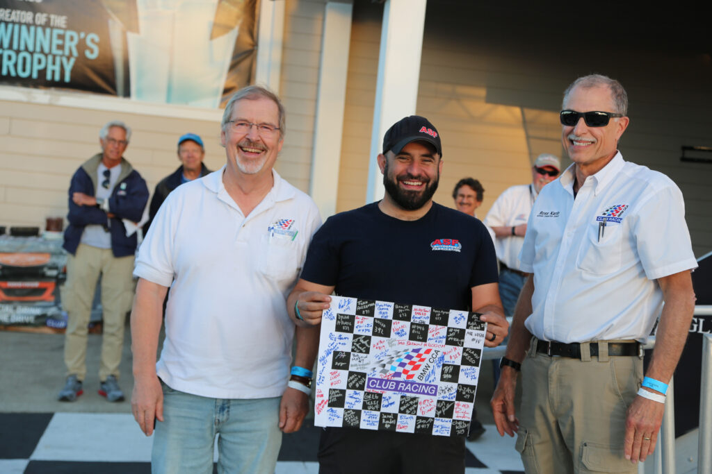 Peter Agapoglou, flanked by Wayne Dobson (left) and Ross Karlin (right) received the Bud Merrill Spirit of Club Racing award for his efforts in supporting racers and assisting Club Racing leaders in addressing a scheduling issue [Susan Dobson photo]