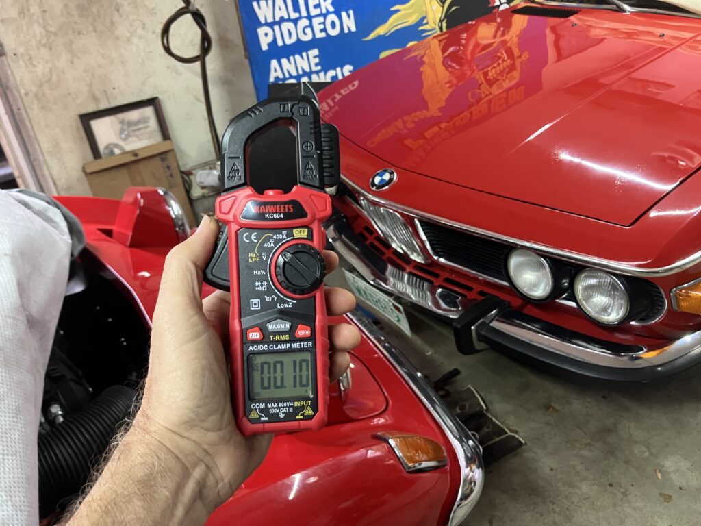 But on the Lotus, I didn’t care about milliamps. If a clamp meter was accurate to within a few amps, that was fine. So I looked on Amazon, found that the $19 clamp meters measured AC current but not DC, and to get one with DC current measurement capability, you needed to kick Jeff Bezos another ten bucks. I clicked and bought this one.