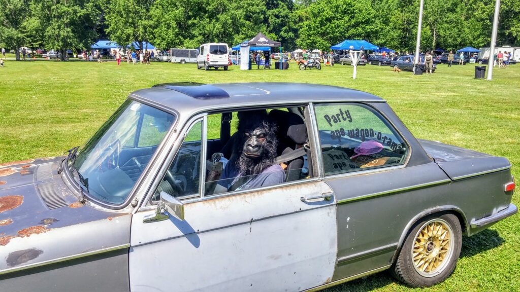 What? If someone leaves a gorilla mask in your ratty 2002, you’re NOT going to wear it when you drive onto The Vintage event field in Hot Sprints? (photo by Brad Day)