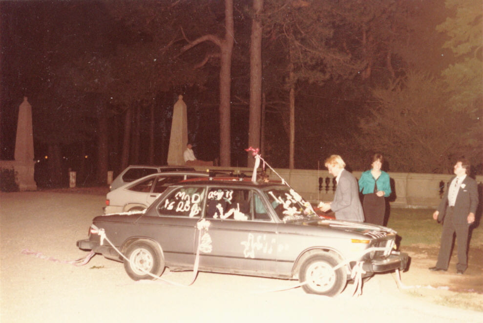 In 1984, as Maire Anne and I began preparing to leave our stint in Austin and return home to Boston to get married, I began looking for a big-bumpered 2002 that would survive Boston’s demolition-derby traffic. I found a rust-free air-conditioned ’75 and christened it Bertha, as with those bumpers, it was anything but dainty. Bertha came back to Boston with us that August. On Labor Day Weekend, Maire Anne and I drove the shaving-cream-and-tin-cans-adorned 2002 off from our wedding.