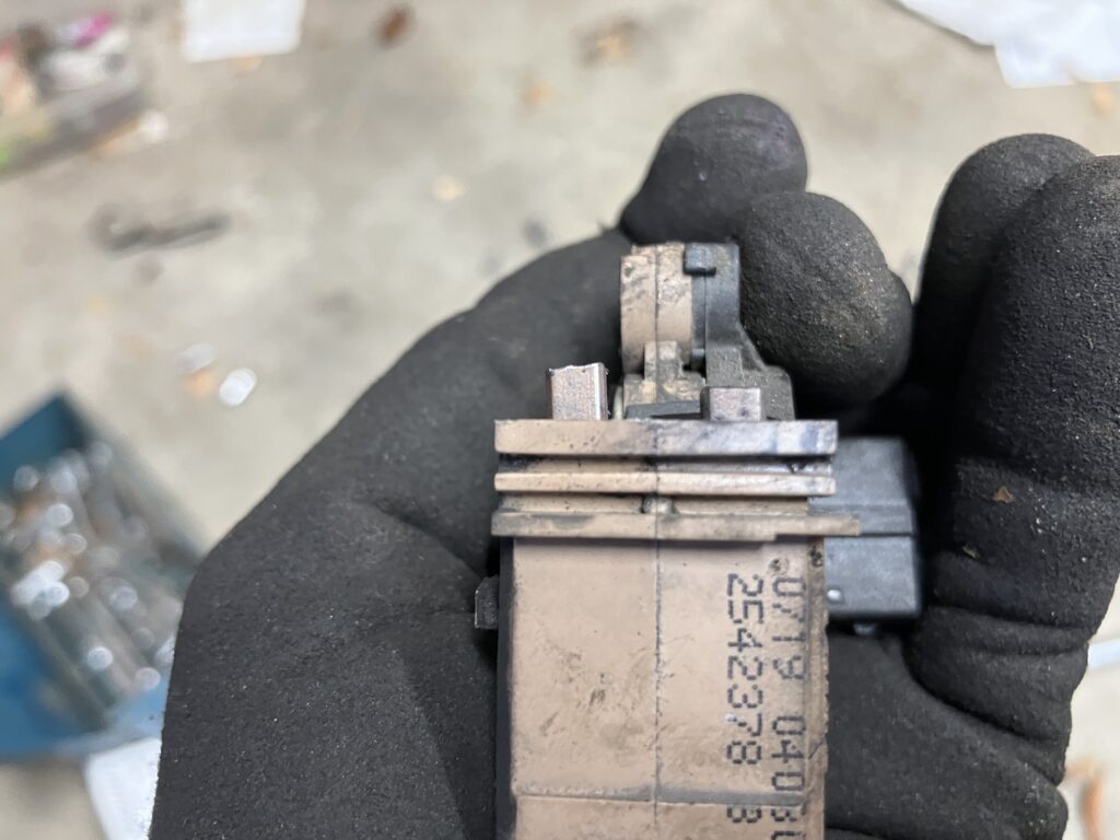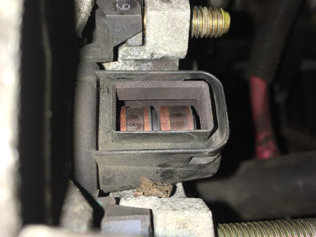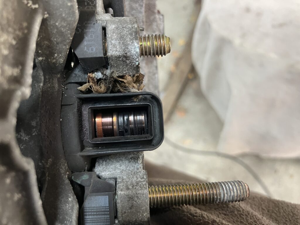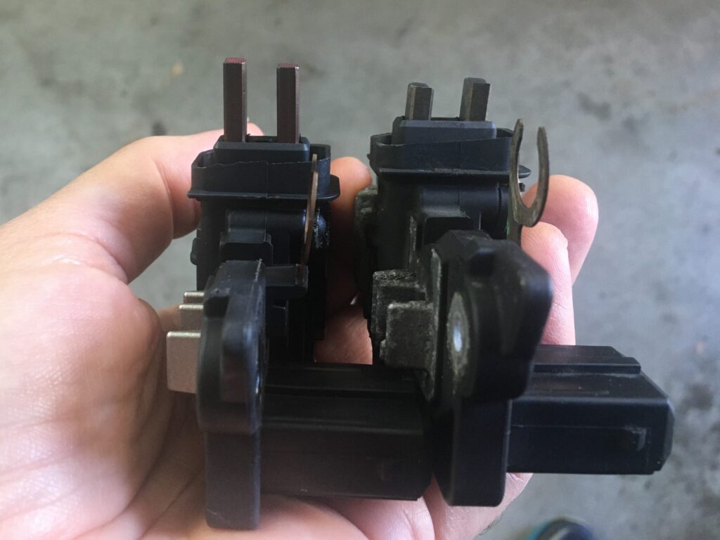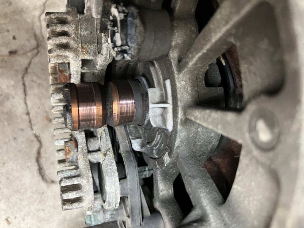 I yanked out the alternator to do a proper post-mortem. This is what I found—one of the brushes had broken clean off from the voltage regulator, and there was visible damage to the slip ring.