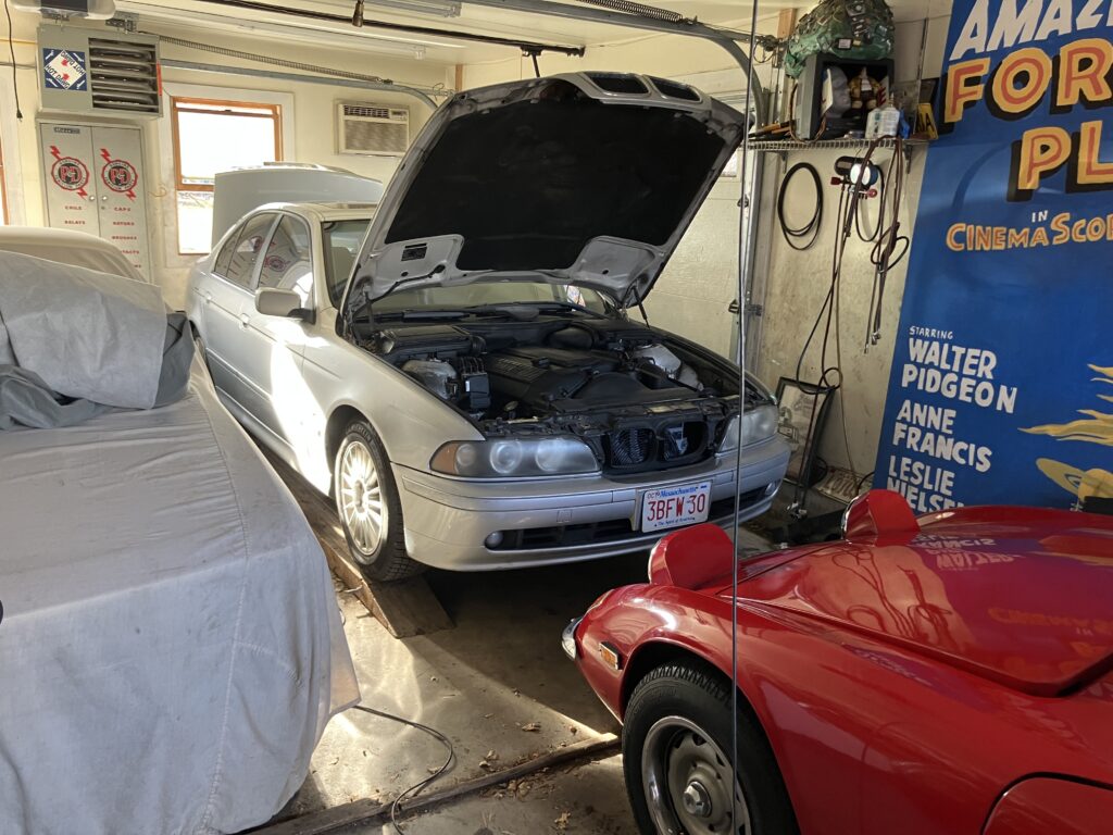 I pulled Bertha and the Lotus Elan +2 out of the garage, restarted the E39 with the jump pack, backed it into the garage, pulled the Lotus back in, and left Bertha to fend for herself in the driveway.