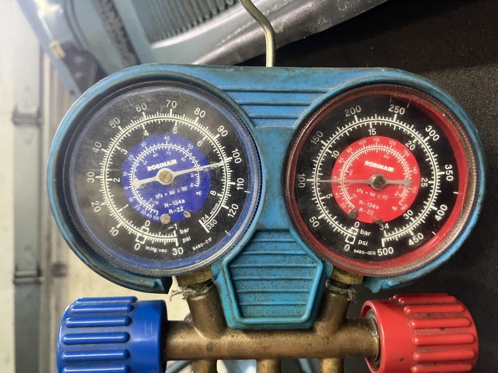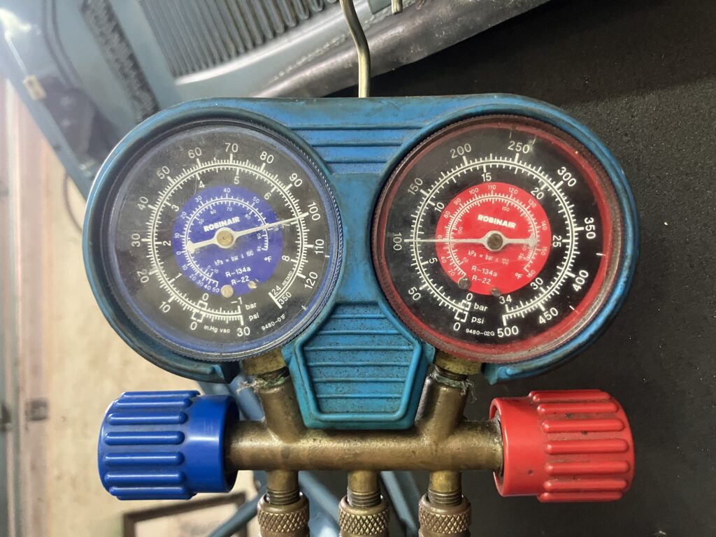 So in I went. The 100 psi of nitrogen didn’t gush out, but over the span of a minute, I could see the gauges slowly falling. I went straight for the Big Blu. I brushed it on the compressor and receiver-drier fittings, and got nothing.