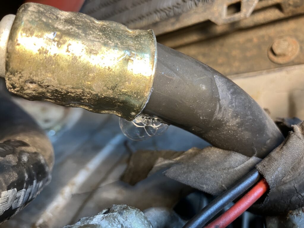 I’d rebuilt Bertha’s a/c, including all new hoses and fittings, when I resurrected the car in 2018-2019, so I didn’t expect relatively new crimps to be leaking, but that’s why I was here, right? I slathered Big Blu onto the crimps of the charging fittings, and immediately saw obvious bubbles erupting from three of the four of them. Holy leaks, Batman!