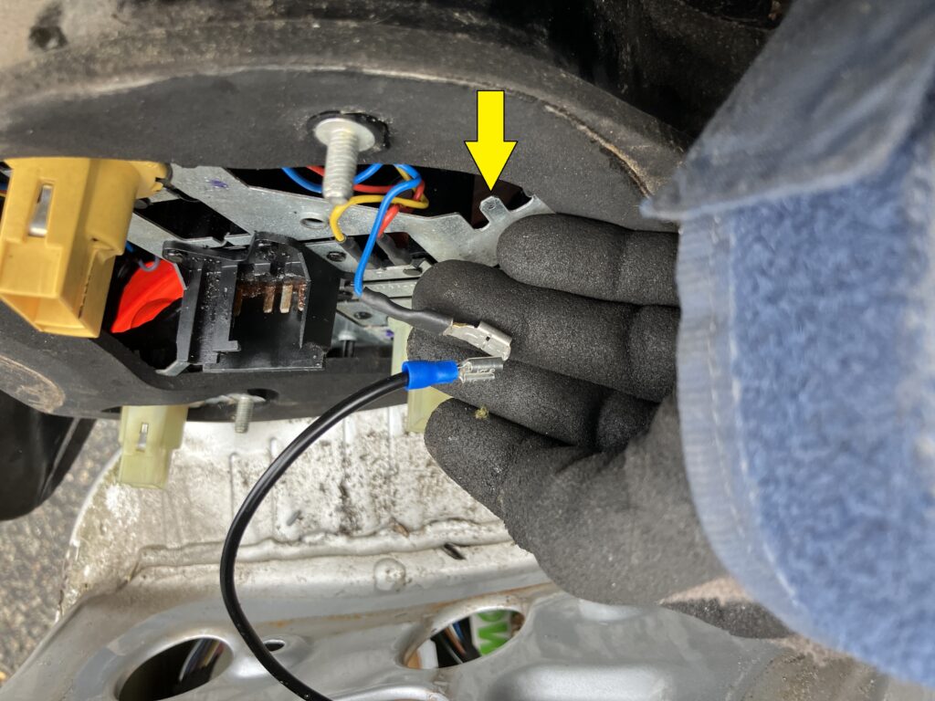 I was about to solder a ground wire onto that plate when I realized there was an even easier solution: I could use a piggyback spade connector, one of those little do-dads where you slide its female end onto a male spade terminal (they’re actually called “quick-connect terminals,” but so many people call them spades that I give up), and it gives you two males.