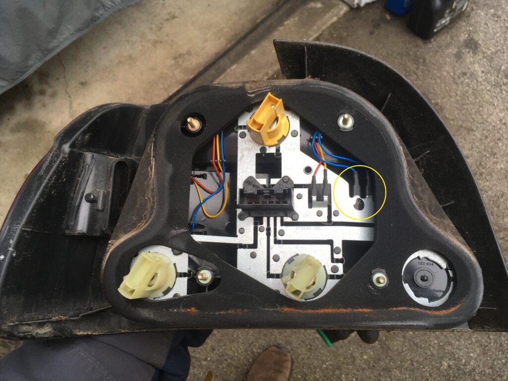 The back of the taillight assembly. The circled area shows where the ground path is shared with other lights.
