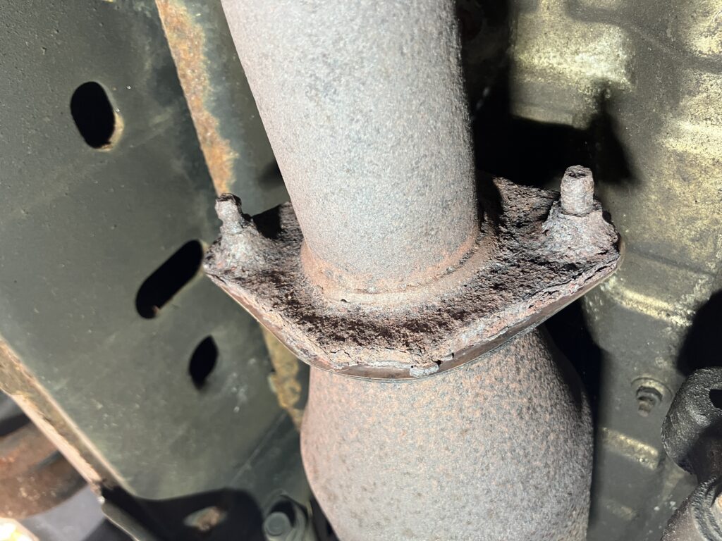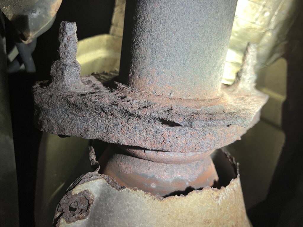 This issue was recently driven home because I needed to deal with all this on my 2008 Nissan Armada. When I bought it two years ago, it was obvious that it had an exhaust leak. I didn’t think much of it, as I routinely do exhaust work. It turned out to be a combination of a small hole in the muffler and a botched attempt someone had done to weld on an aftermarket tailpipe that was the wrong diameter. To get it through its first Massachusetts state inspection, I shoveled muffler cement into the hole, and reattached the tailpipe using a chain of reducing adapters. When it failed inspection a year later, it was because the muffler was no longer patchable. No big deal, right? I found a well-priced aftermarket exhaust on RockAuto to replace everything behind the cats, but the left rear cat flange was terrifyingly weak. I knew that if I broke it, I was going to be in a world of pain, because the flange connecting the pre- and post-cat was also rusty. And if the front cat needed to be removed, in addition to the usual hell of dealing with the studs connecting it to the head, the access to it is really difficult, and folks on the Armada forum recommended removing the front differential to get at it. Yeesh. Fortunately, I managed to get the left rear flange apart without breaking it.