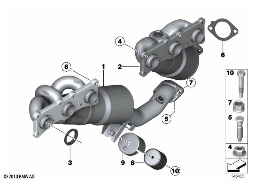 Just for fun, since I keep my eyes open for an E91 3 Series wagon, I thought I’d look at the exhaust configuration and the cost. As per the photos below, it does indeed have two pre-cats integrated with the exhaust manifold, and two post-cats. The dealer list price on each of the pre-cats is $1632, and the post-cats list each for $1813. The list prices on the center resonator ($790) and muffler ($1390) are relative bargains.
